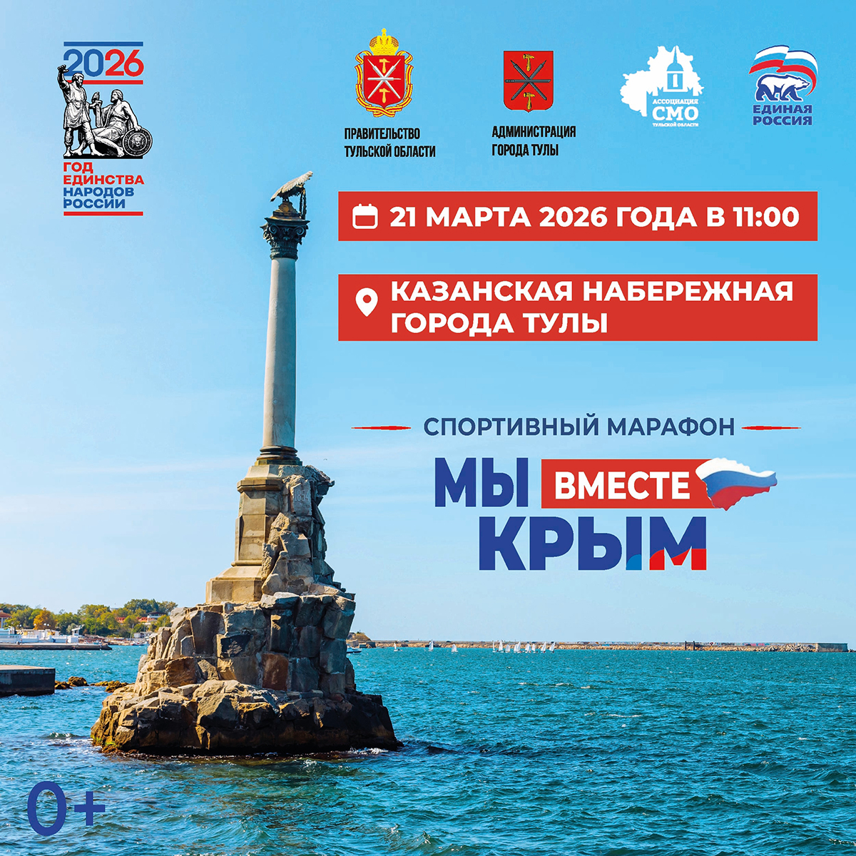 21 марта в 11.00 на Казанской набережной Тулы пройдет спортивный марафон «Мы вместе Крым». Мероприятие приурочено к 12-й годовщине воссоединения Крыма и Севастополя с Россией.
