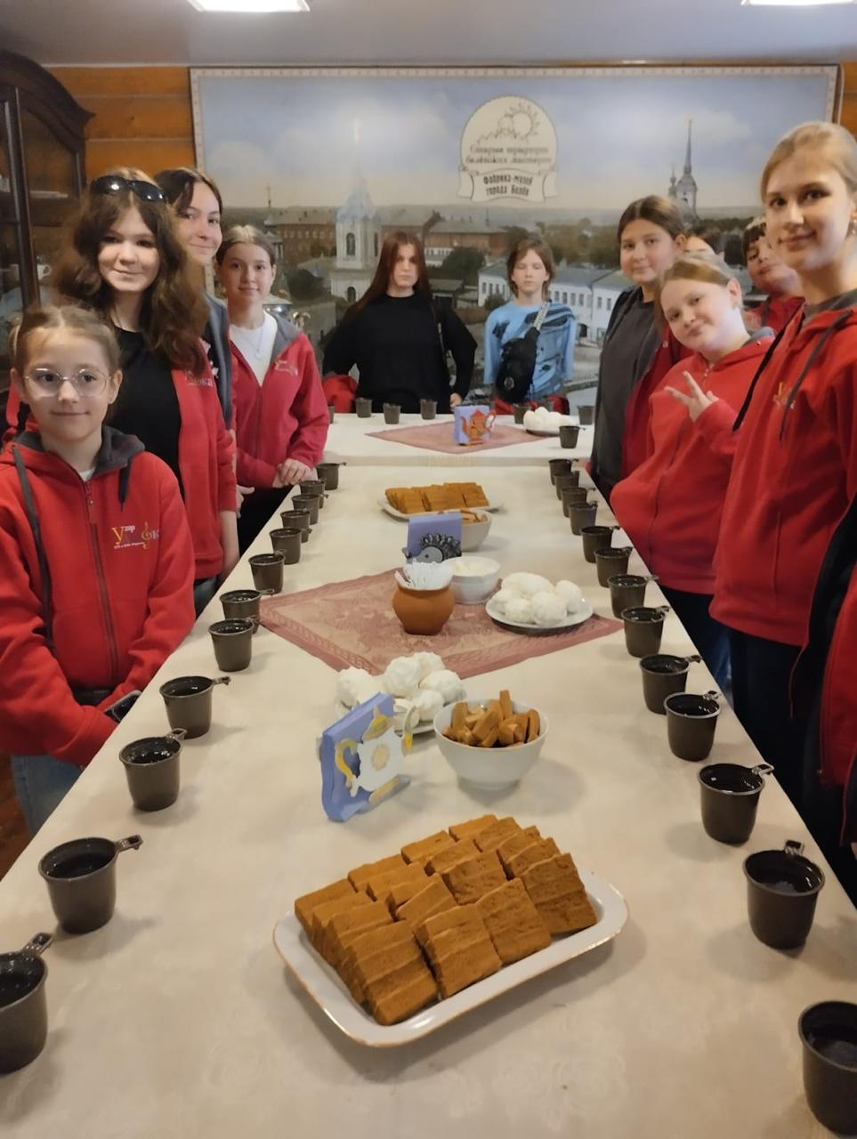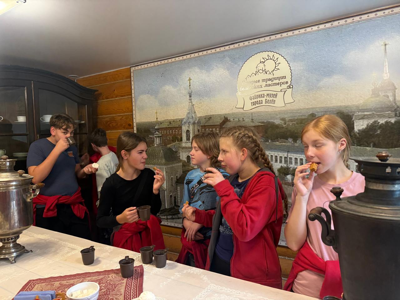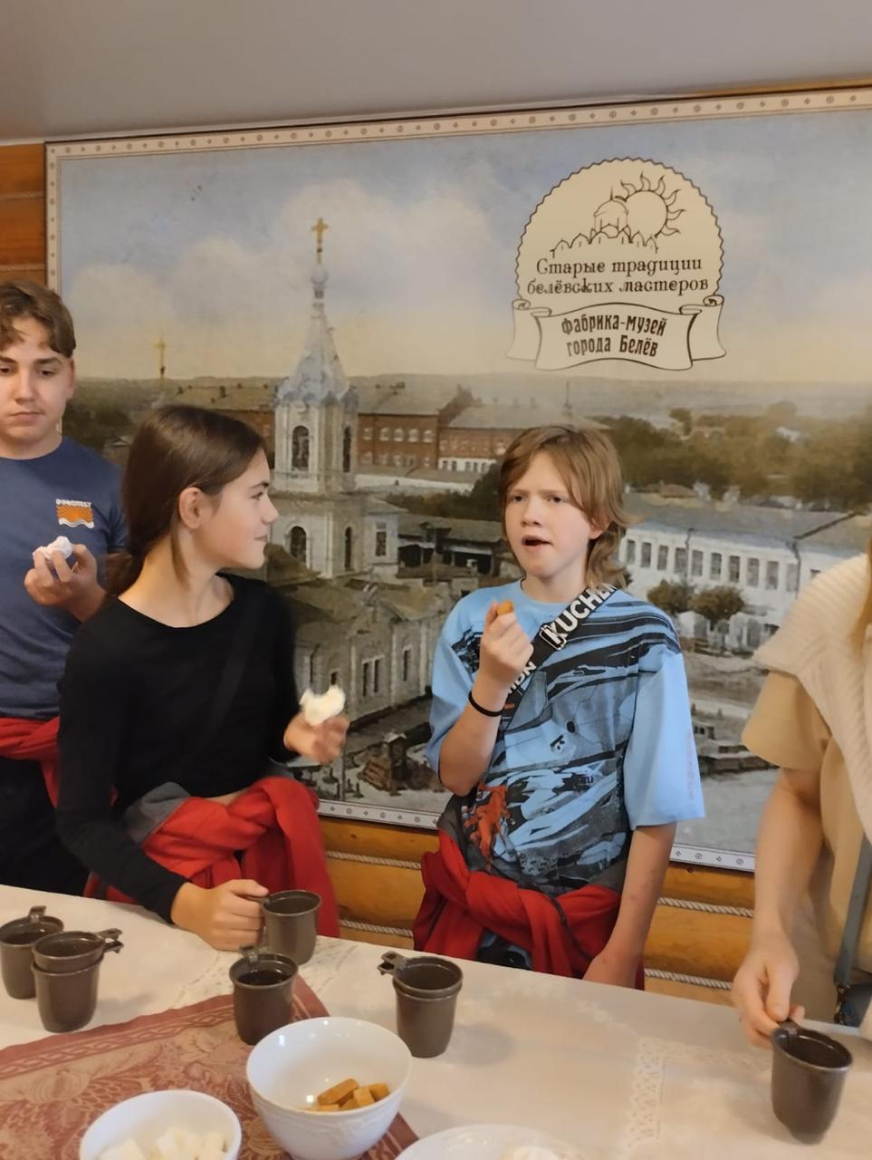 Но ребят ждала не только она. Гости с удовольствием услышали и о других наших брендах - коклюшечном кружеве и глиняной игрушке. Ну и, как обычно, в завершении программы всех ждало традиционное белёвское чаепитие с пастилой и другими лакомствами.