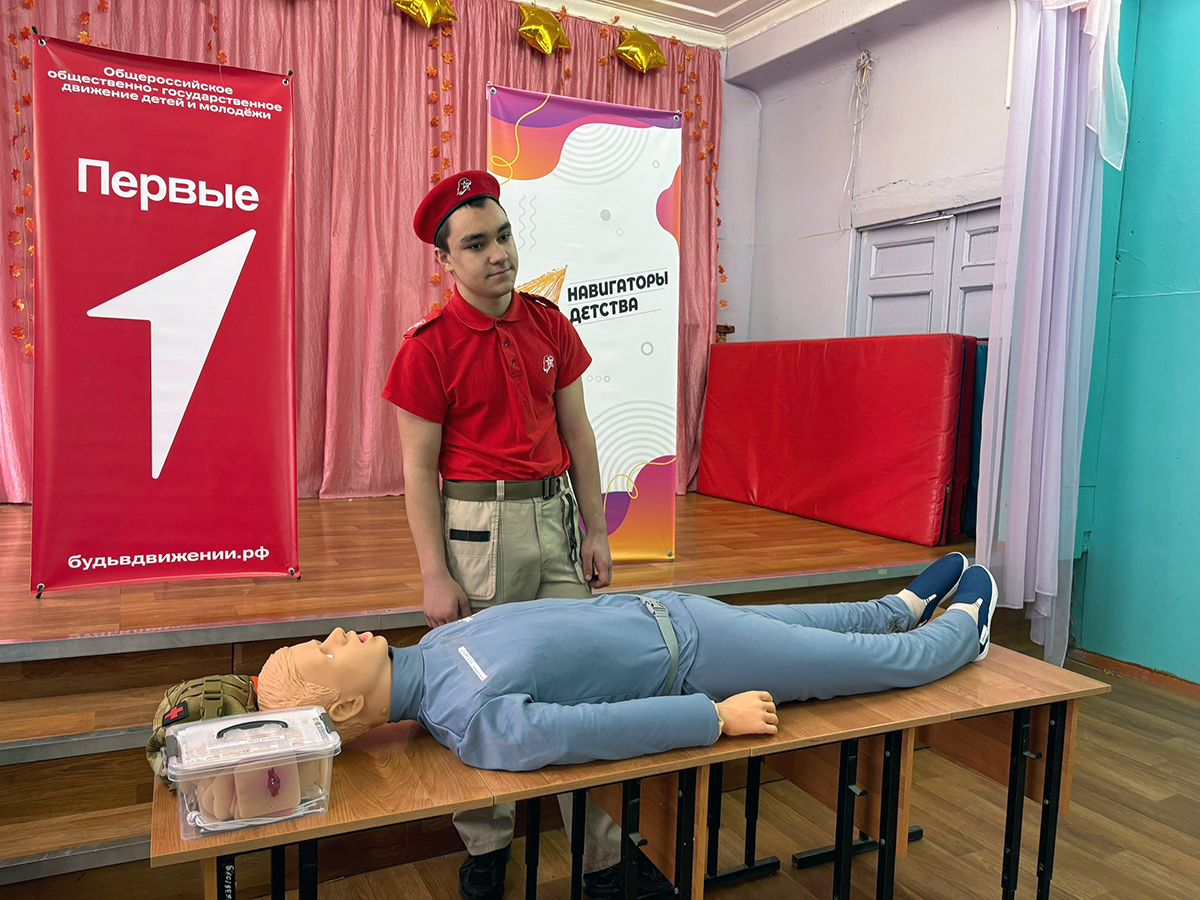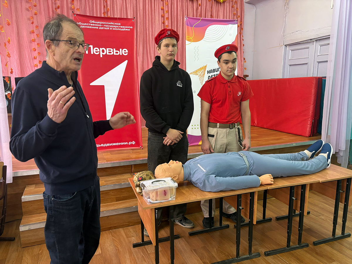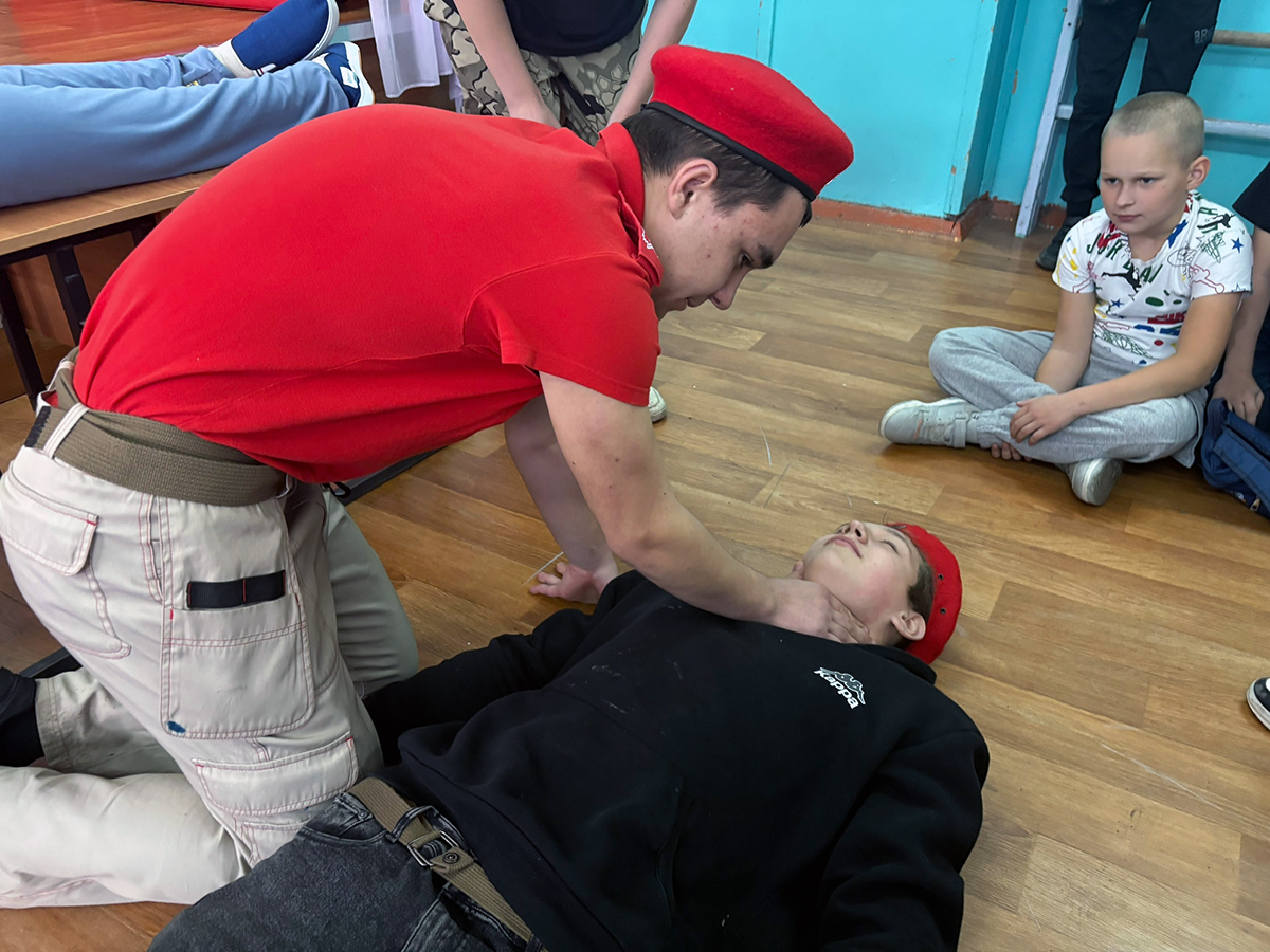 Старшие участники наглядно показали младшим, как правильно проводить искусственную вентиляцию легких и непрямой массаж сердца на манекене-тренажере. Участники отработали полученные знания на практике, используя медицинские бинты и эластичные ленты.