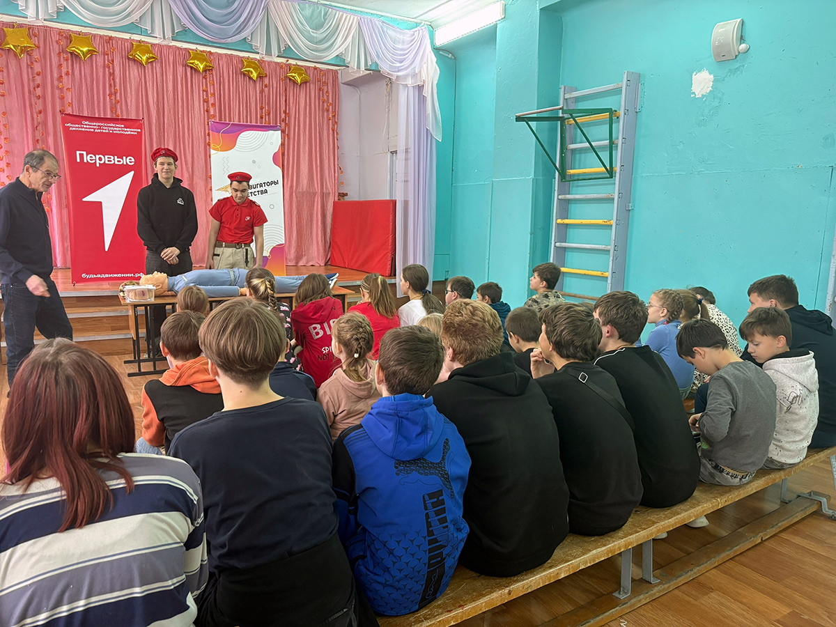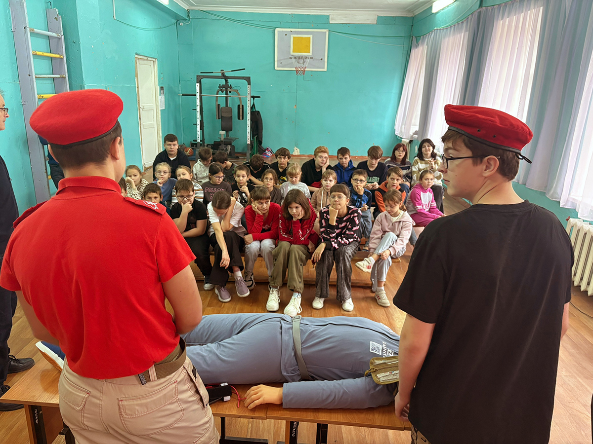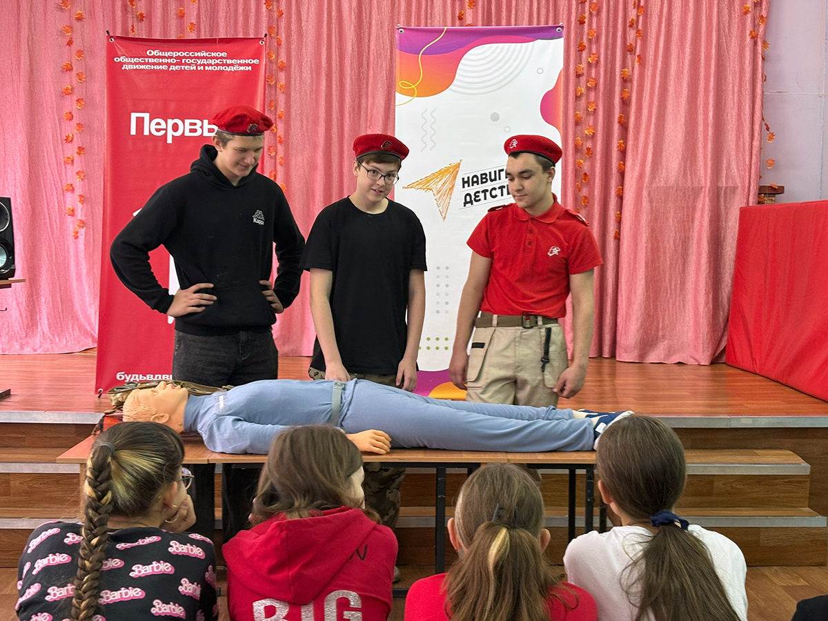 Старшие участники наглядно показали младшим, как правильно проводить искусственную вентиляцию легких и непрямой массаж сердца на манекене-тренажере. Участники отработали полученные знания на практике, используя медицинские бинты и эластичные ленты.