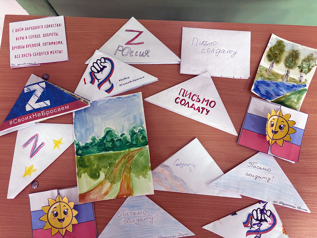 Письма, открытки для героев от мальчишек и девчонок пришкольного лагеря были изготовлены в рамках акции «Едины - непобедимы». Послания были переданы волонтерам для дальнейшей передачи бойцам СВО.