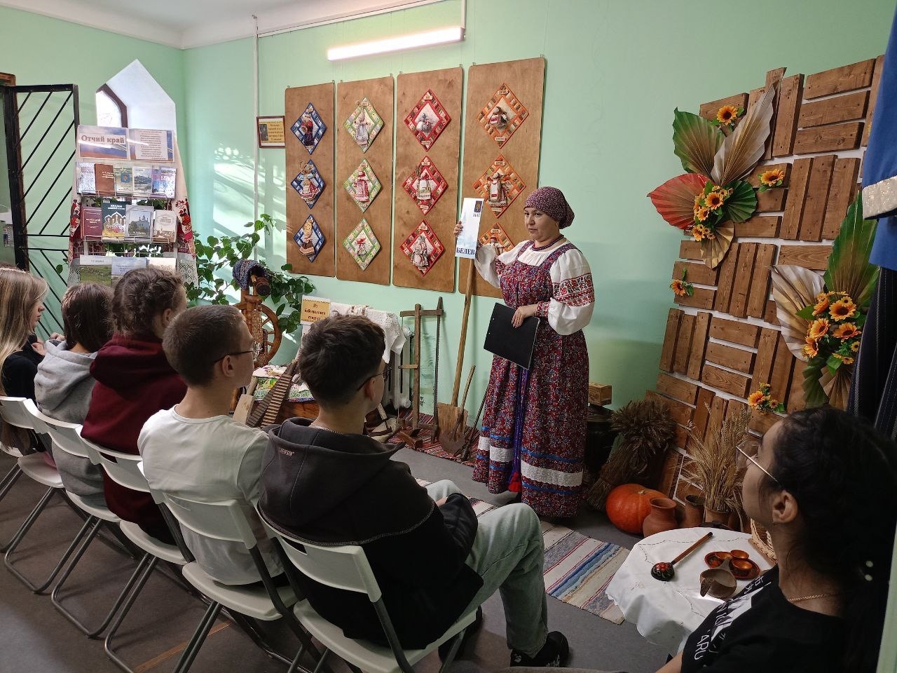 Студенты ознакомились с книжной выставкой-инсталляцией «Отчий край» и фотовыставкой «Разноцветная палитра Белёвского края». Также они посетили экспозиции, посвященные творчеству белёвских мастеров: «Умелые руки Юрия Горбушина», где были представлены деревянные поделки, и «Традиционная народная кукла своими руками», где можно было увидеть работы Оксаны Анюниной и Софьи Путинцевой.
