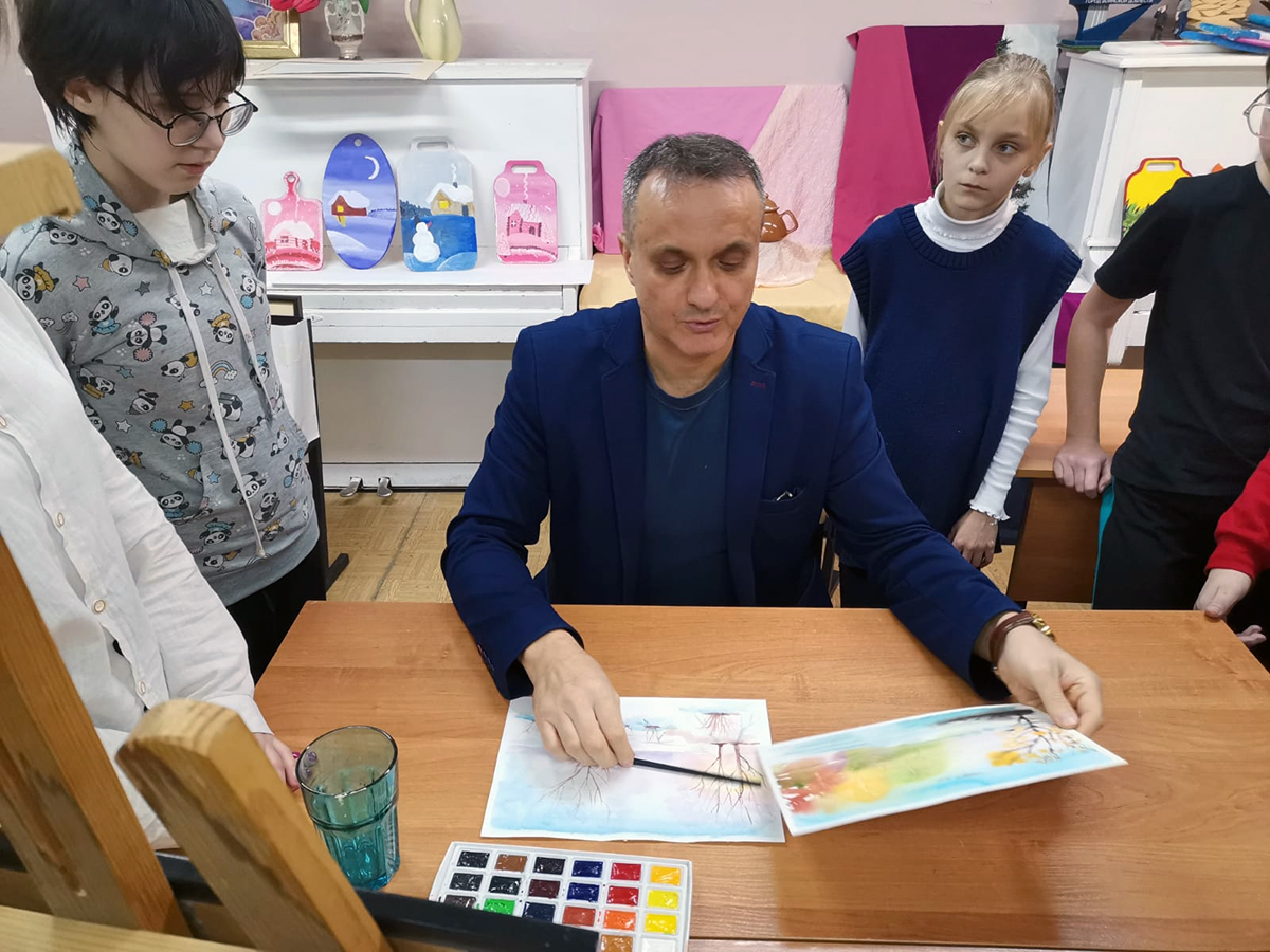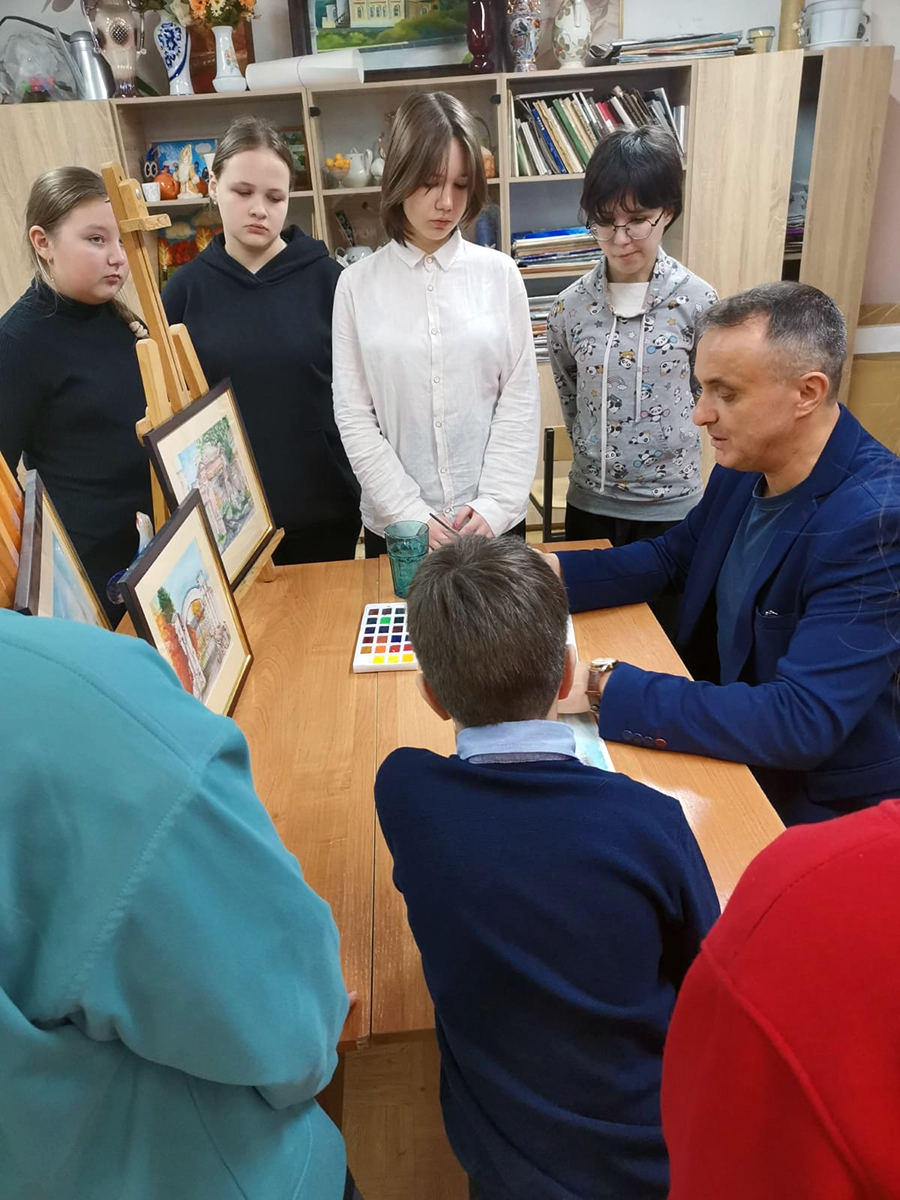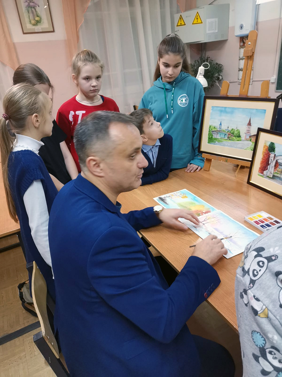 В Белёвской детской школе искусств прошёл открытый урок, на котором художник и педагог Олег Юрьевич Хорьков поделился с детьми секретами работы с акварелью и провёл небольшой мастер-класс по этому виду живописи.