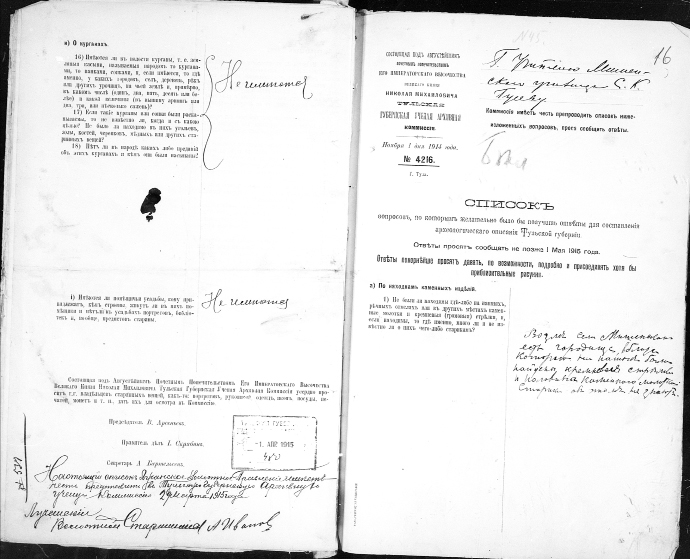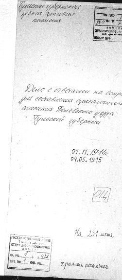 Тульская губернская ученая архивная комиссия под председательством В. Арсеньева в 1914 году адресно направляла просьбу владельцам старинных вещей с целью их осмотра сотрудниками. Прилагались печатные листовки с необходимыми вопросами, ответы на которые интересовали учению комиссию. В перечне значились древние каменные молотки и кремневые стрелки, информация о длинных насыпных валах, пещерах, городищах, курганах, сопках, помещичьих усадьбах с предметами старины.