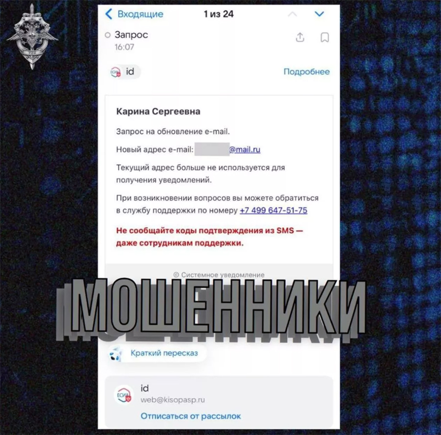 Как уточнили киберполицейские, в письме указан поддельный номер телефона техподдержки, при этом мошенники используют схожие с официальными логотипы, адресно обращаются к пользователю и даже советуют никому не сообщать коды подтверждения из СМС.